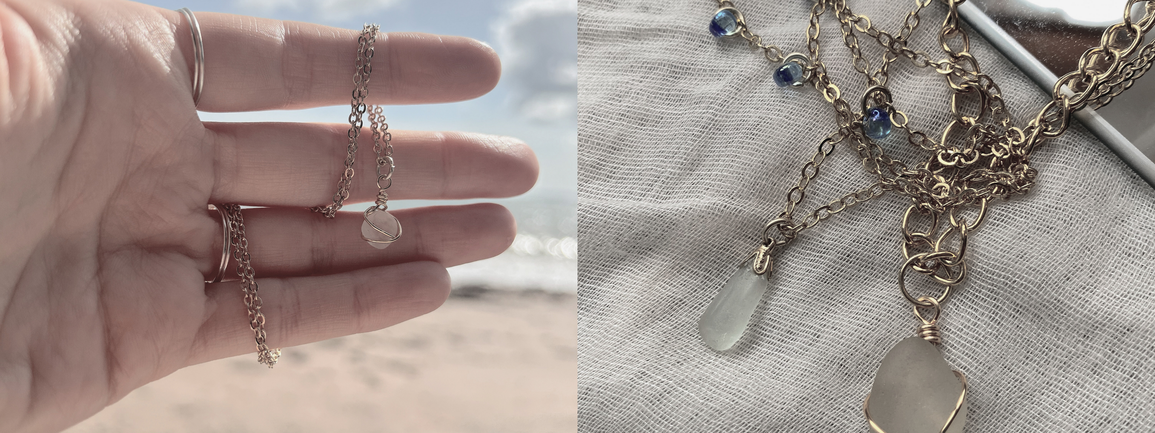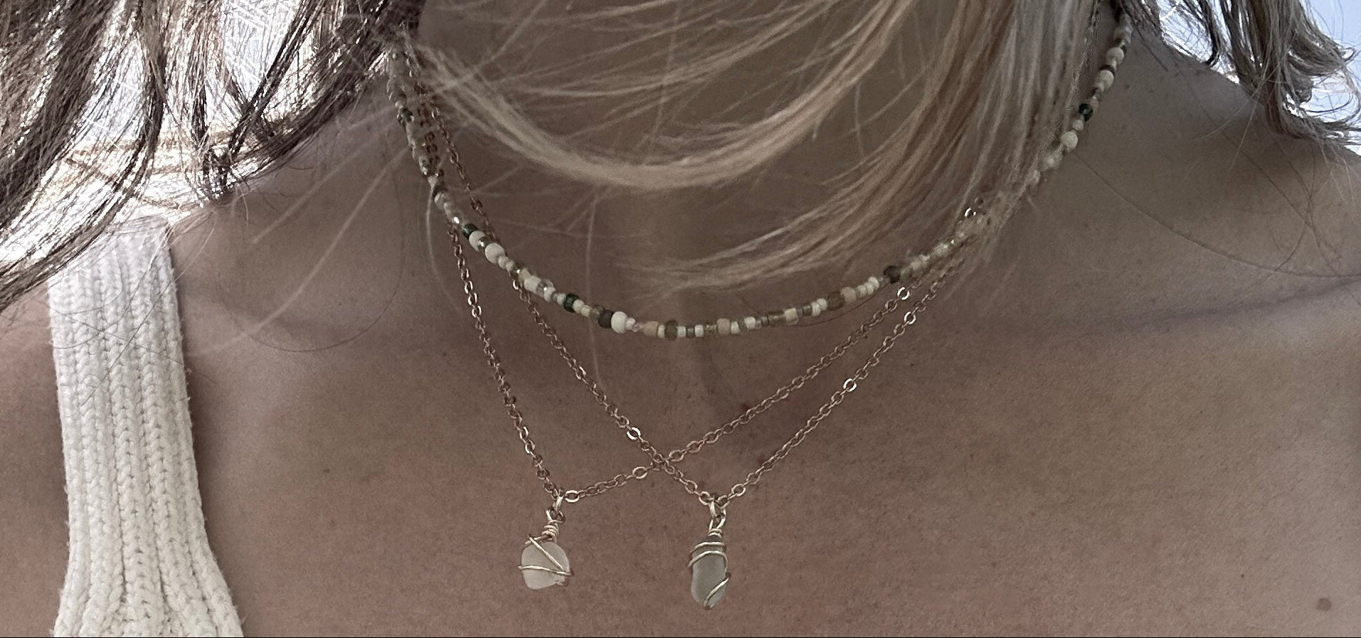 Wearable statement jewellery made with sea-worn glass from Devon & Cornwall beaches.